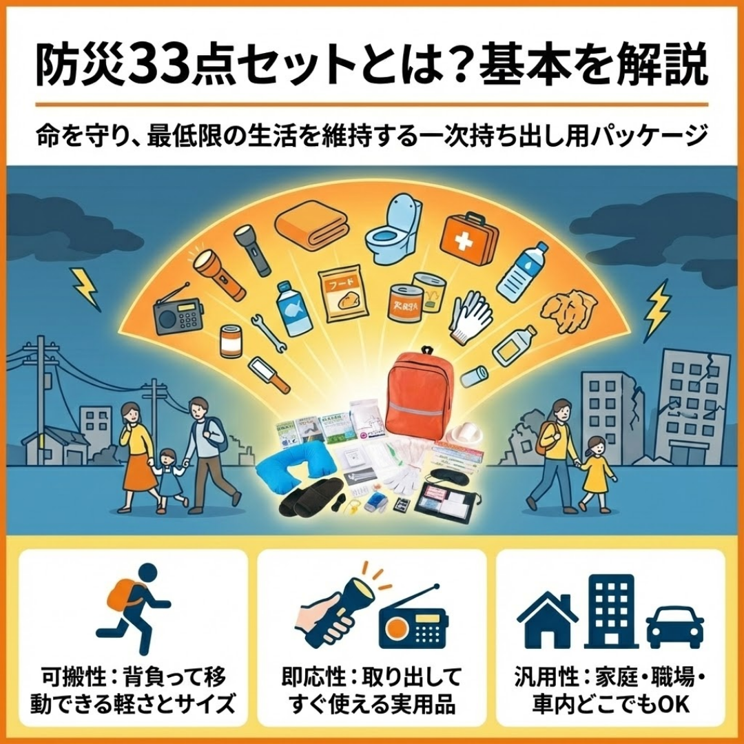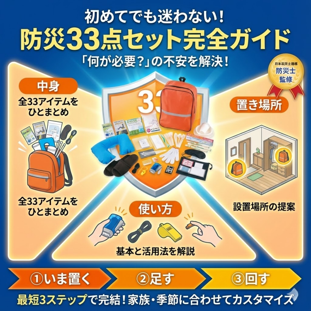 「防災グッズ、何をどれだけ揃えれば正解?」――そんな不安を一気に解決するのが“必要最小限”をひとまとめにした〈防災33点セット〉です。本記事では、セットの基本と全33アイテムの中身、最短で備える3ステップ、よくある失敗の回避法、家族構成・季節に合わせたカスタマイズまでをやさしく解説。読み終えたら“いま置く・足す・回す”が迷わず実行できます。