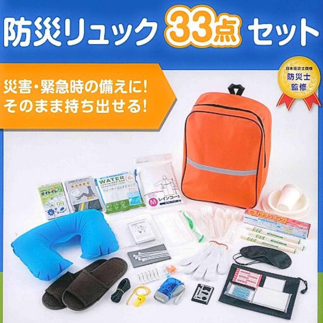 以下が今回の〈防災33点セット〉の正式な内訳です(ライブ配信の紹介順・表記を整理)。