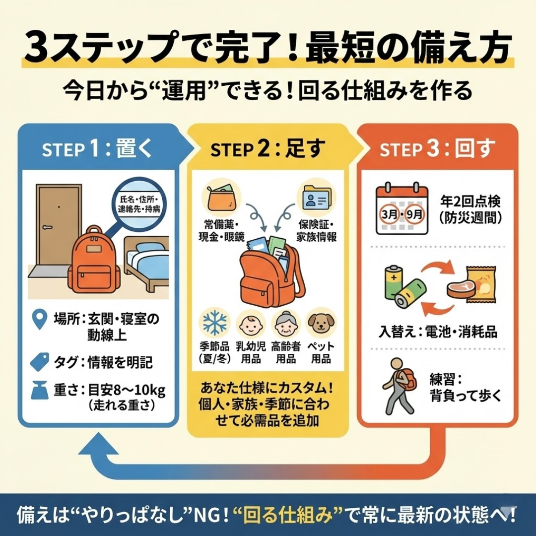 結論:①置く → ②足す → ③回すの順で、今日から“運用”できる備えにします。