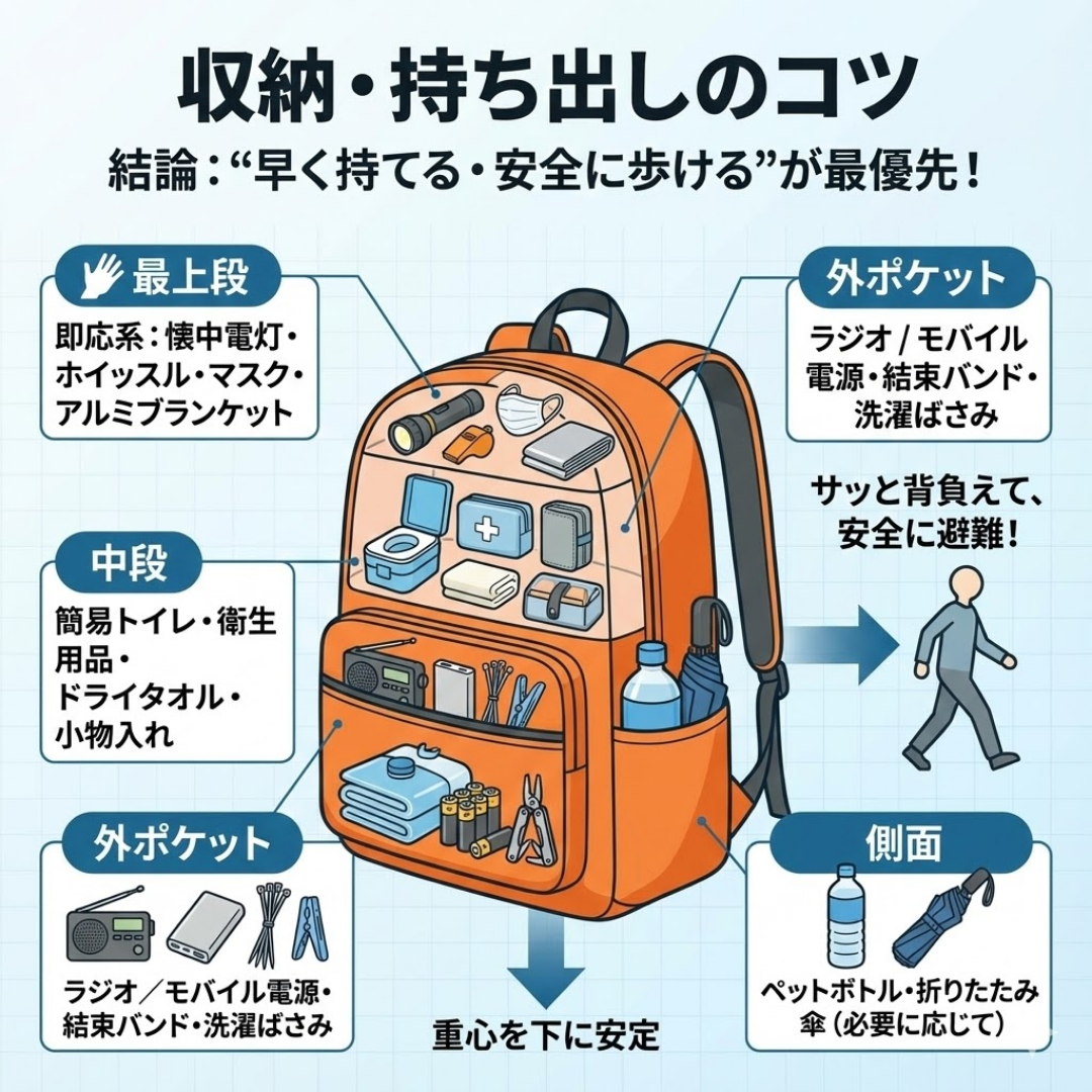 結論:“早く持てる・安全に歩ける”を最優先に詰め方を決めましょう。
