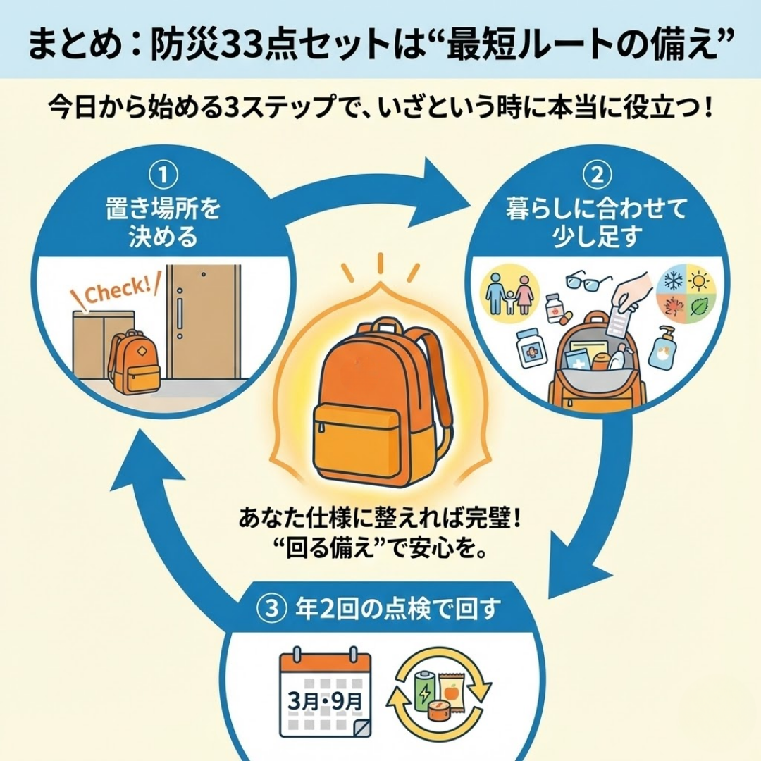 再結論:置き場・追加品・点検日の3点が決まれば、備えは“やりっぱなし”ではなく“回る仕組み”になります。