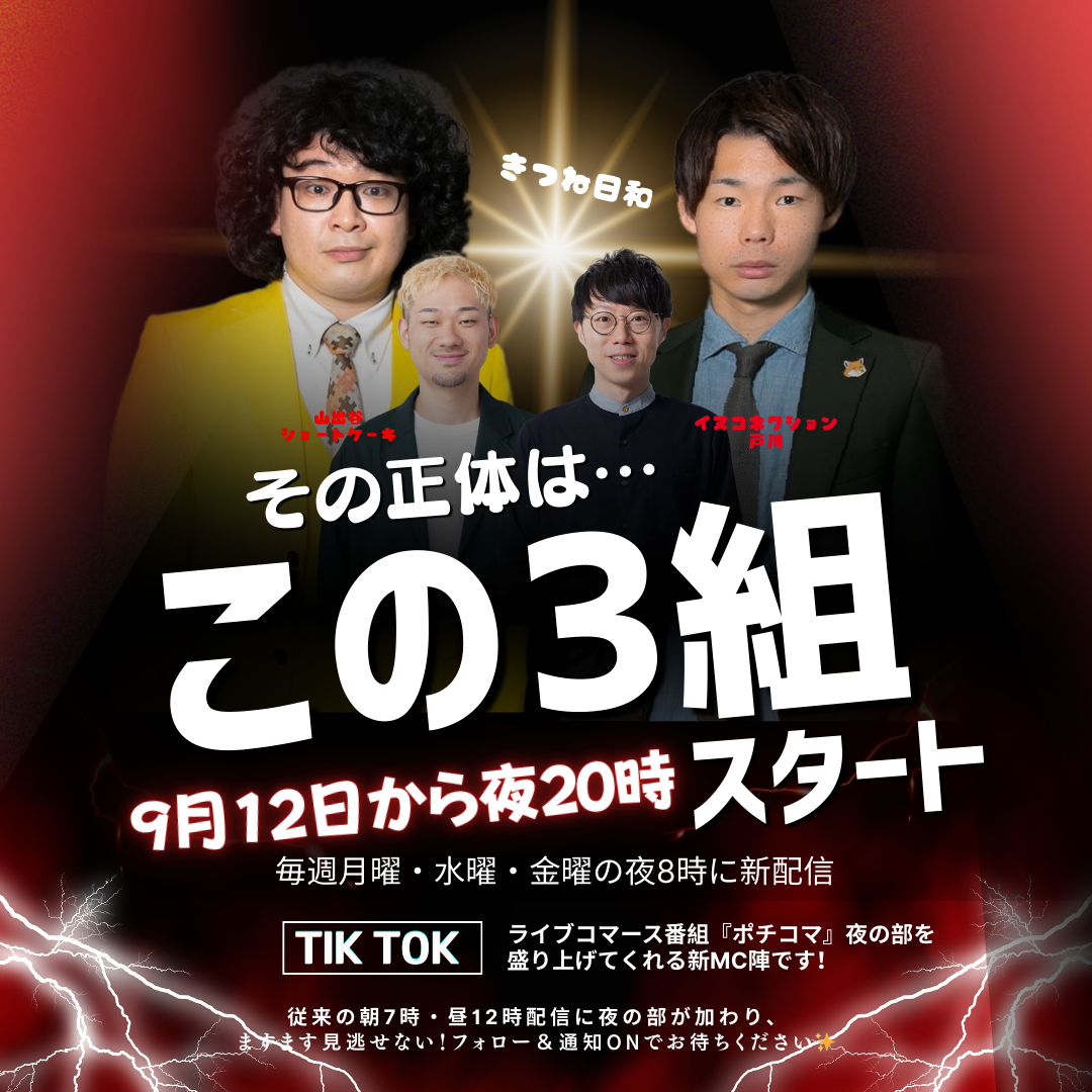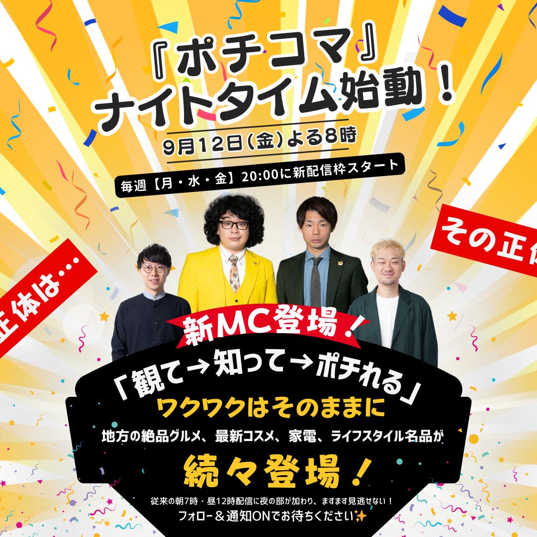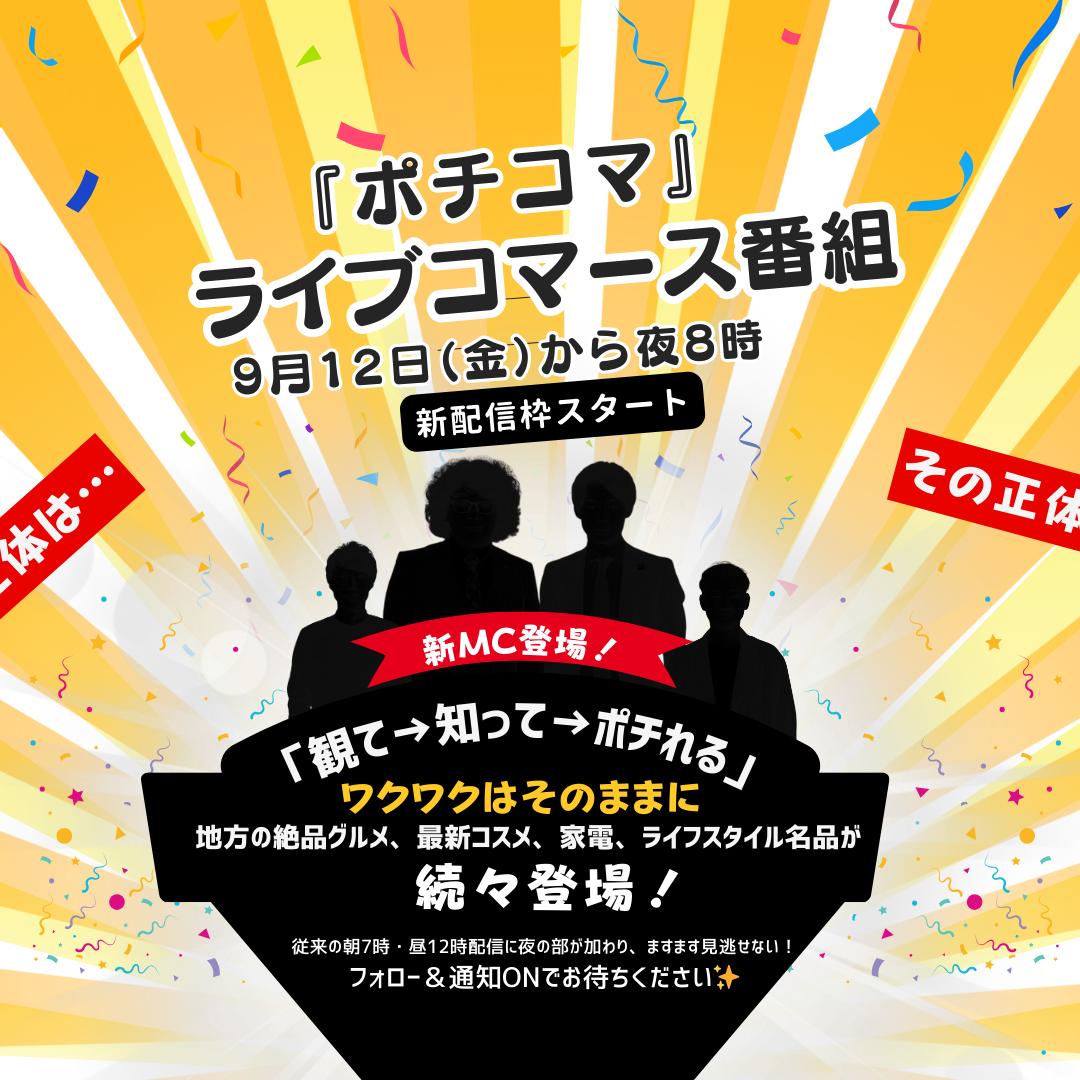 “ポチッとつながる、新感覚ライブコマース”『ポチコマ』ファンの皆さんに嬉しいお知らせです。2025年9月12日(金)から、ついに夜20時の新しい配信枠がスタートします🎉しかも新MCも加わって、ポチコマがさらにパワーアップ✨夜のポチコマも要チェックですよ〜!