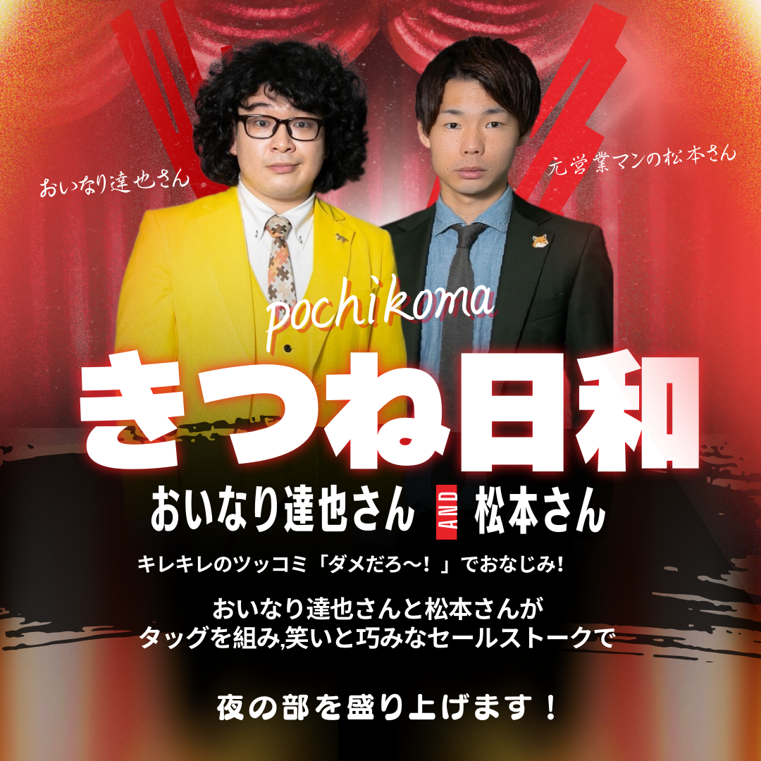 • お笑いコンビ「きつね日和」:2019年結成、賞レース優勝経験もある実力派漫才コンビ。鋭いツッコミと軽快なボケで夜の配信を笑いで包んでくれます。