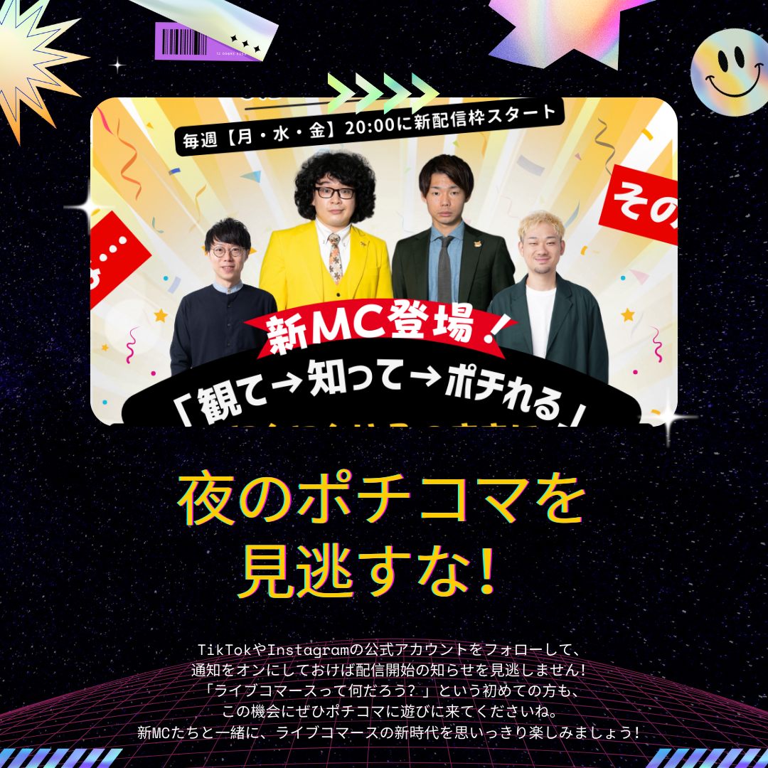 個性豊かな3組が交代で夜配信のMCを担当し、エンタメ感120%の配信をお届け!新MCの登場で、ポチコマはますますパワーアップします。笑いあり、驚きありの夜のライブ配信にご期待ください!